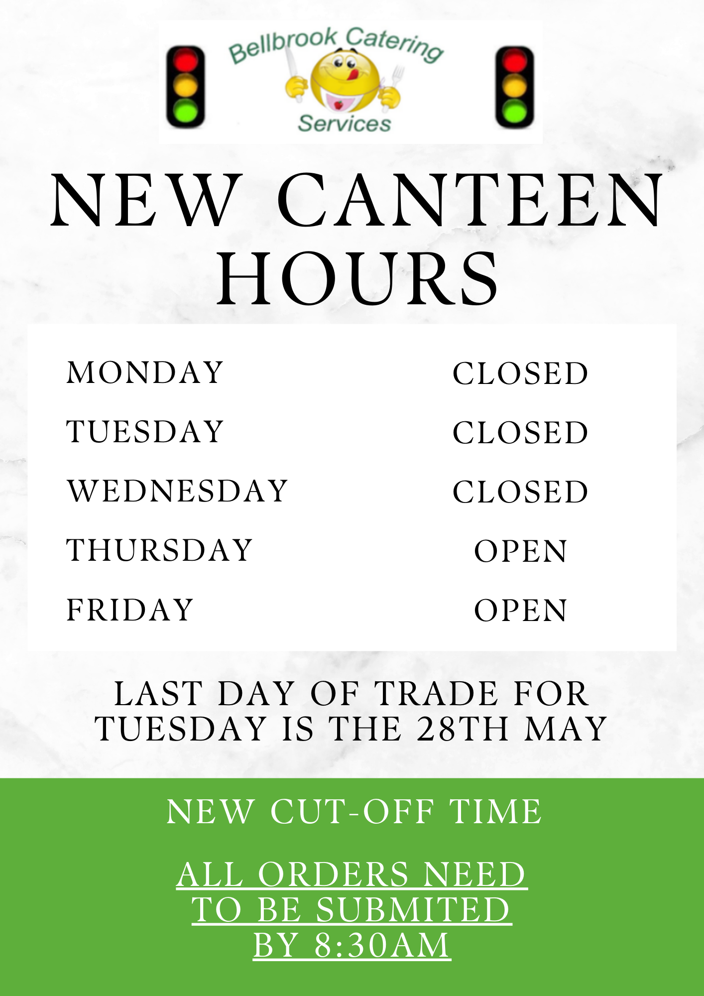 The Canteen operates Tuesday, Thursday and Friday from 9:00am to 2:00pm Each morning, lunch orders are placed in boxes in the classrooms where they are taken by monitors to the canteen for processing. Counter sales are provided each day at morning recess.